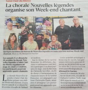 Vous trouverez ci-dessous un article du Dauphiné Libéré parlant de notre prochain week-end chantant ( à retrouver sur la page d’accueil, dans “La presse parle de nous”):